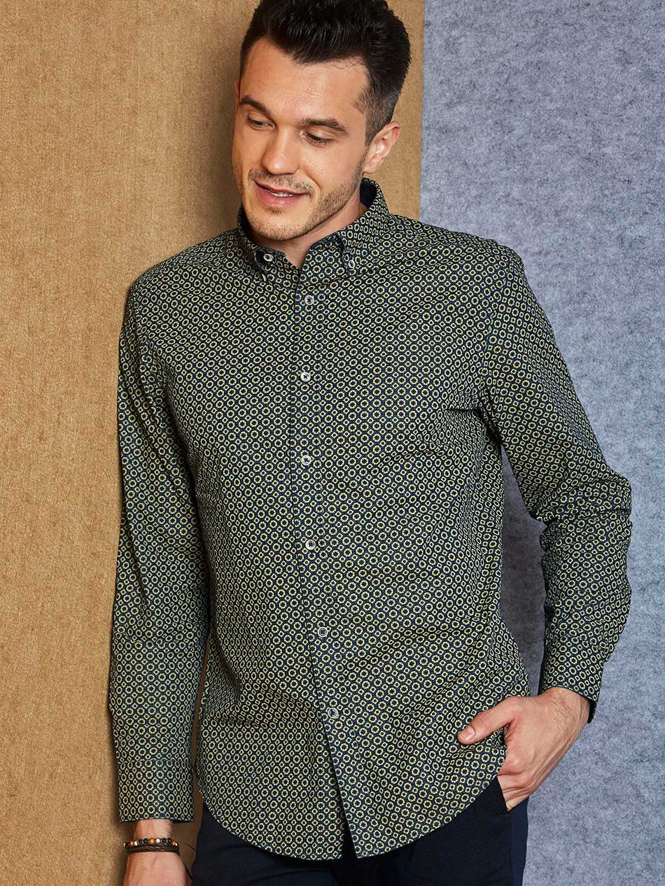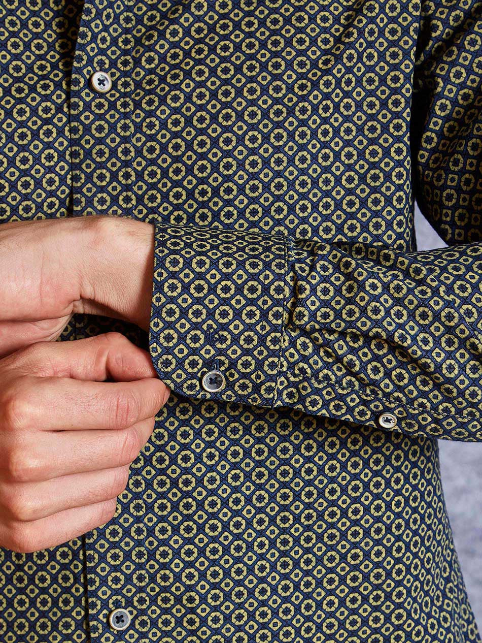 Our version of a Dressier Denim shirt. It has an all over geometric print which oozes a bit of the indigo navy base when seen closely.