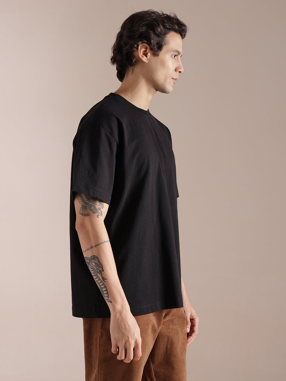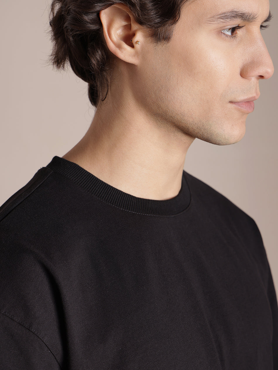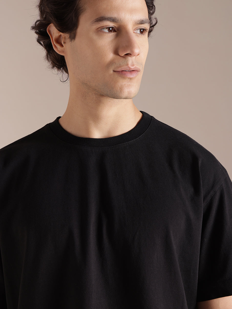 Elevate your everyday essentials with the Black Horizon Heavy Tee. Crafted from premium 100% cotton single jersey fabric, this 220 GSM relaxed-fit t-shirt ensures exceptional comfort and durability. The rich black shade pairs effortlessly with any wardrobe, making it your go-to for versatile styling. Perfect for casual outings or layering under jackets, this t-shirt redefines premium basics for men. The model is 6'0" tall, wearing size M.