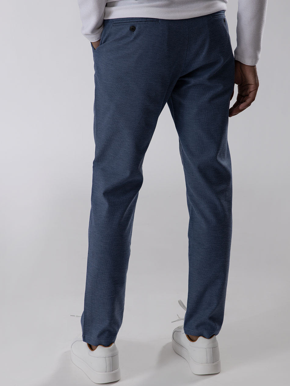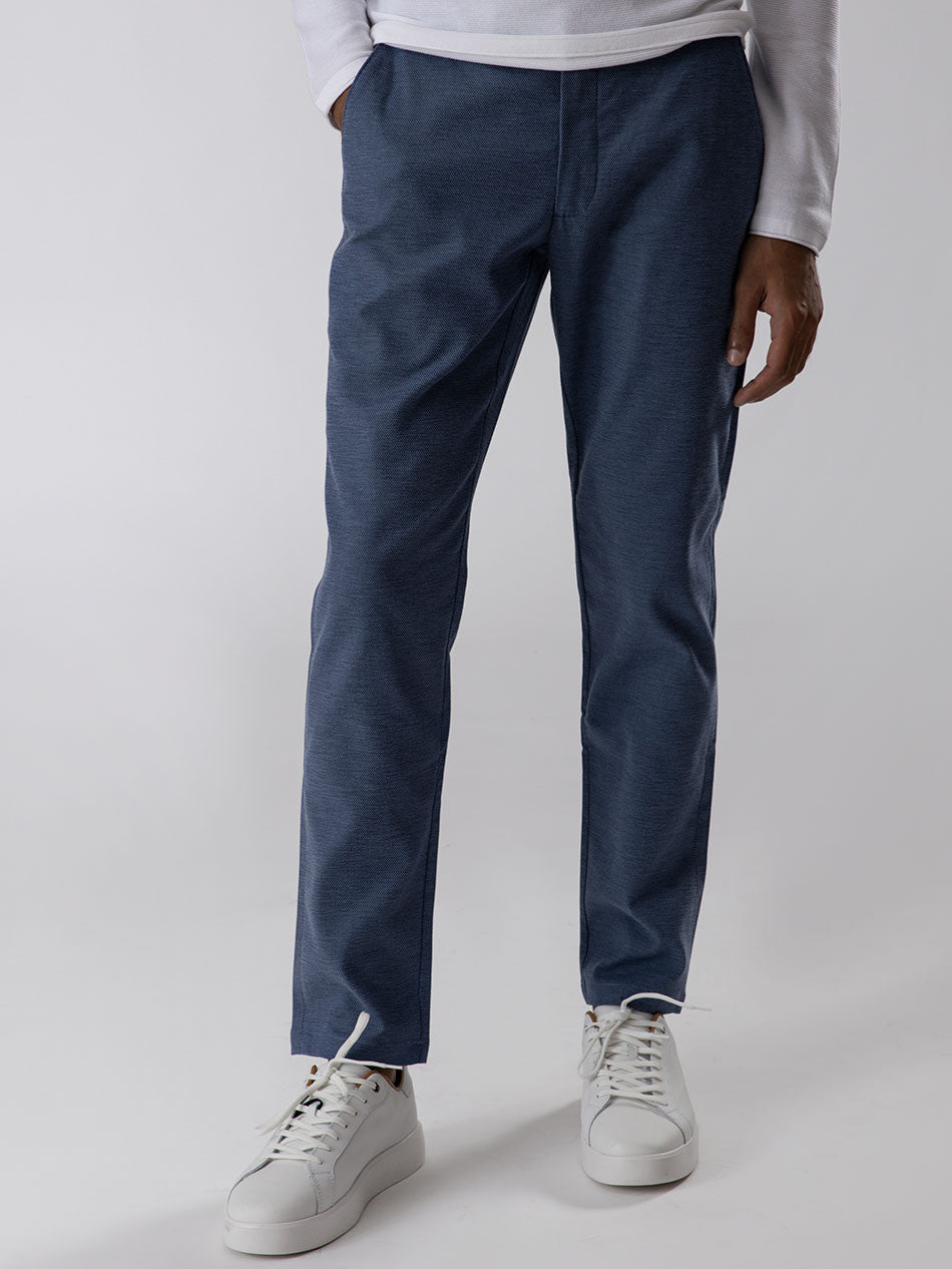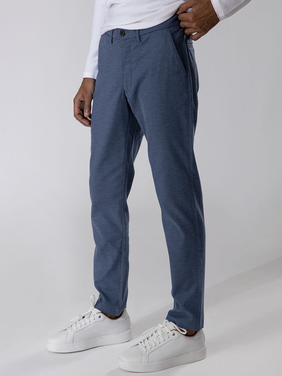 Our Blue dobby chino is a winning mix of textures a luxurious finish. Cut to a slim, tailored silhouette in a luxurious cotton dobby fabric with a hint of stretch,this pair is a versatile piece that can be easily dressed up down.