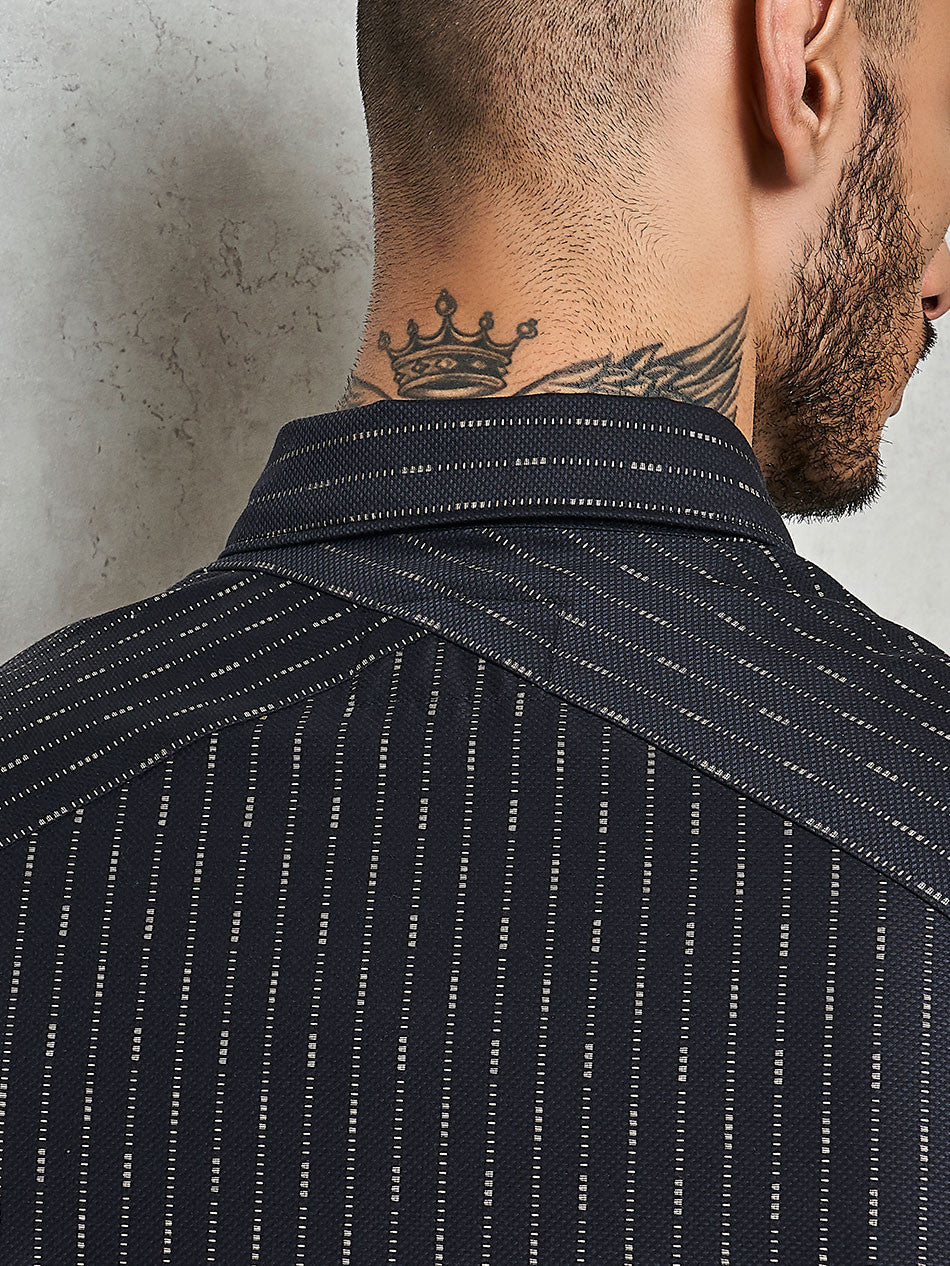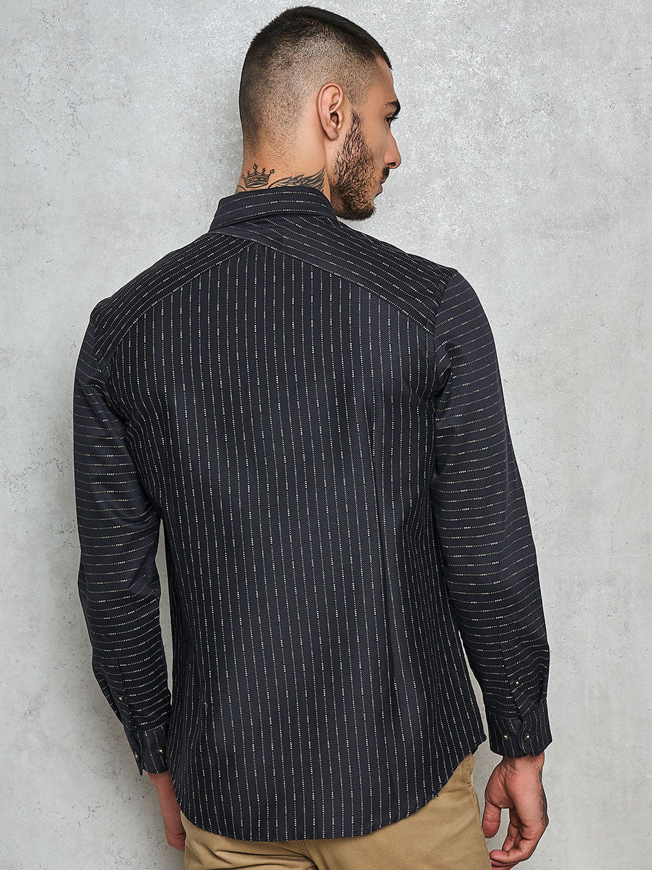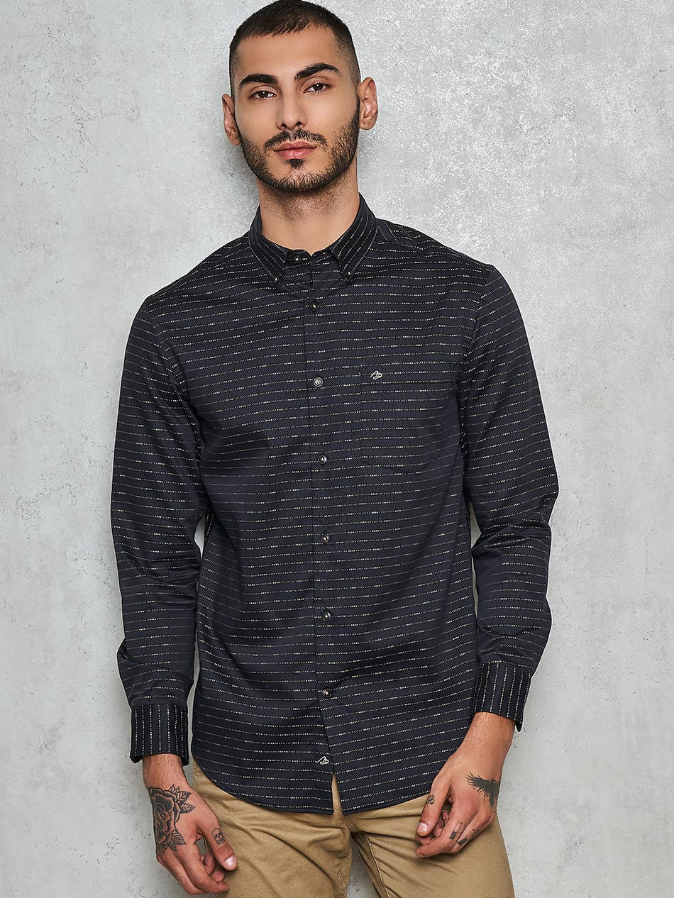 The shirt has horizontal stripes running at the front vertical stripes at the back. The bake yoke is cut in diagonal to make it more edgy. The jacquard fabric is a sure conversation starter.Go on, explore this beauty and find more hidden details that you will love.