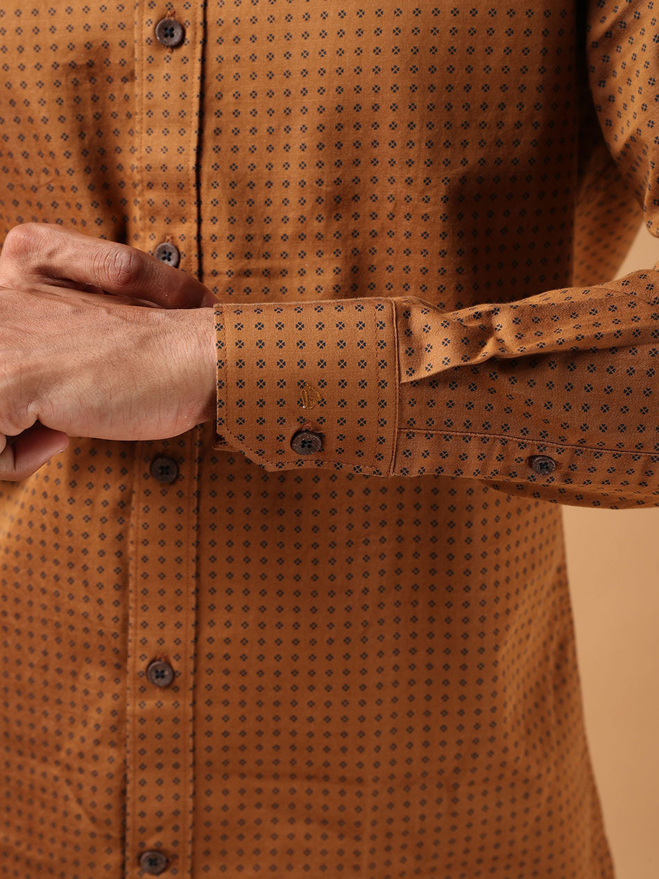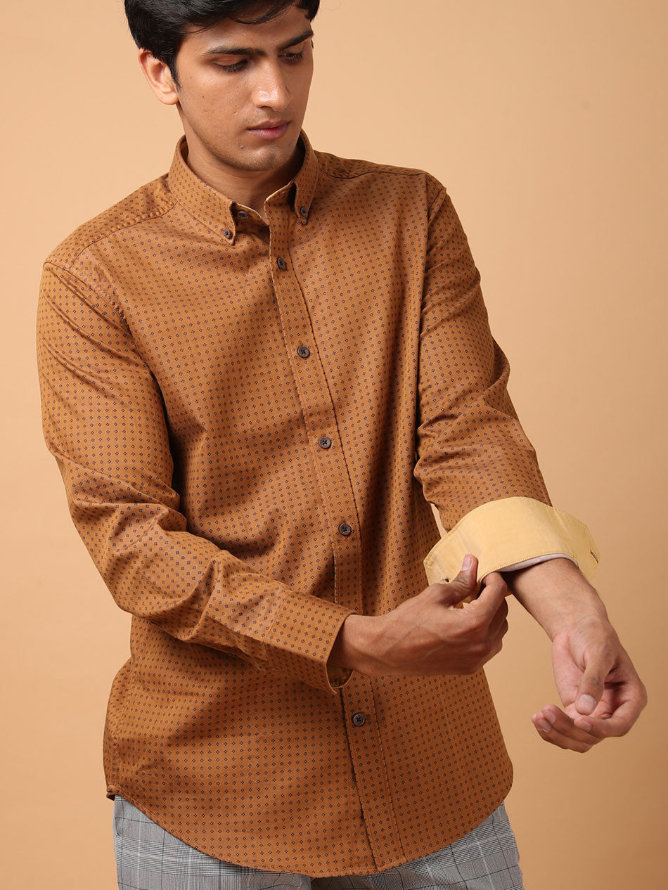 This beautiful shade of mustard is a must have for those who are looking to add a standout color to their wardrobe. This shirt is perfect to be worn to your parties or semi- formal events. The tiny heart shaped motif's combine to form an overall micro print texture.