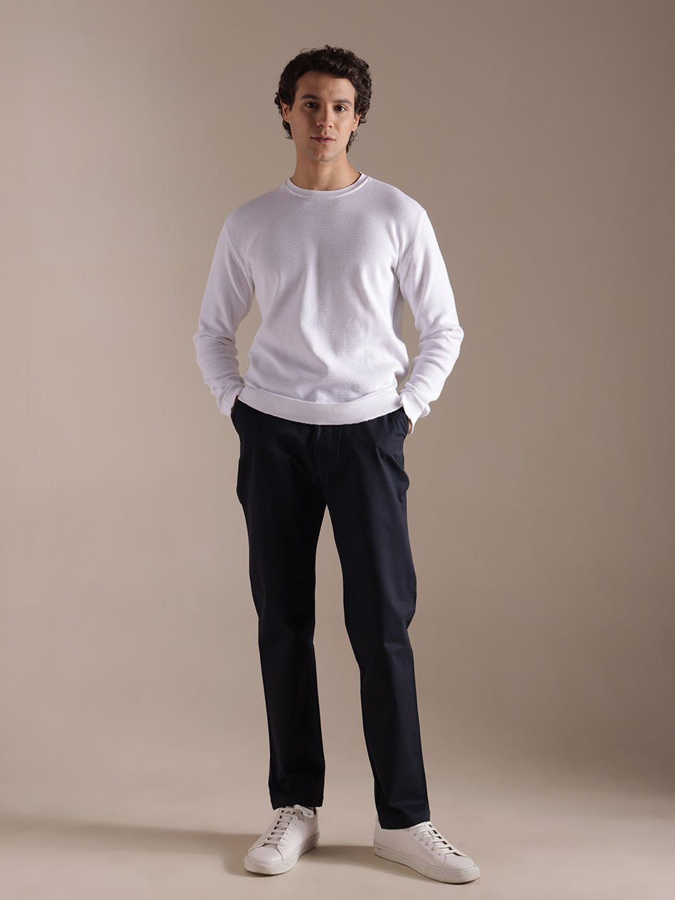 An homage to elegance. The Sapphire Night Chinos are tailored from deep navy cotton twill, combining luxury with versatility. High-rise, regular fit—crafted for those who move with quiet confidence. Model is 6 ft tall, wearing size 31.