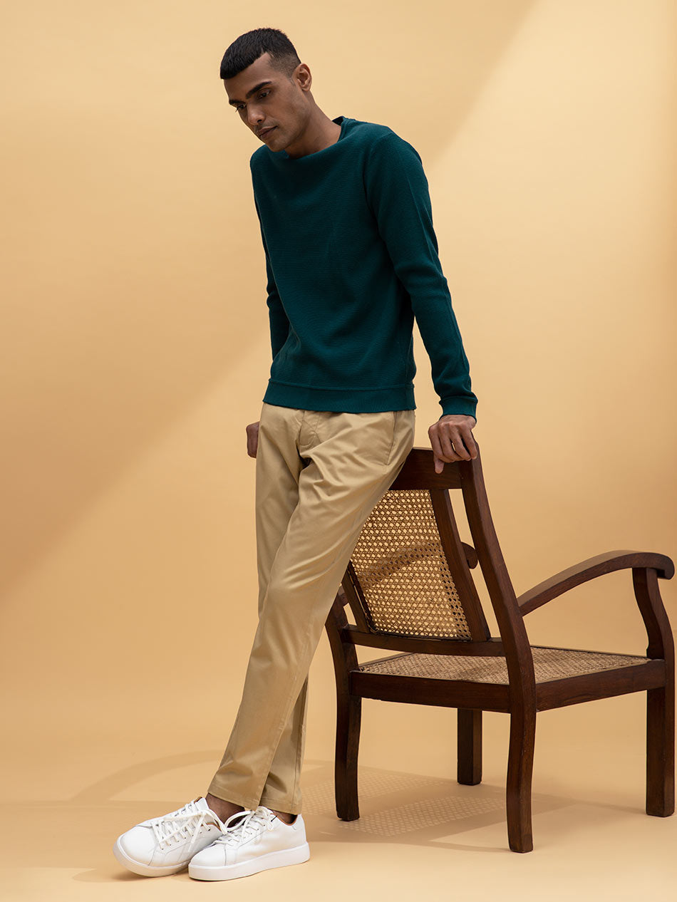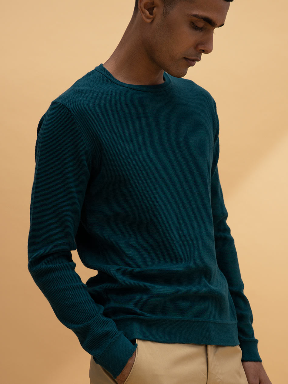 Find serenity in our Teal Men's Long-Sleeved Knitwear. Made from premium supima cotton, our long-sleeved tee offers both comfort and style in its calming hue. Elevate your wardrobe with timeless elegance. Shop now!
